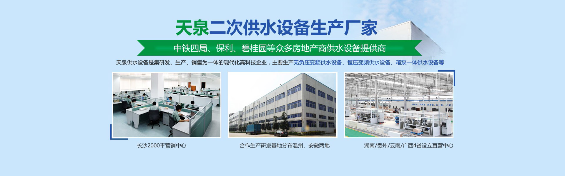 長沙天泉供水設備有限公司位于長沙雨花經濟開發(fā)區(qū)。公司是集研發(fā)、生產、銷售為一體的現(xiàn)代化科技型企業(yè)公司生產銷售的產品有無負壓變頻供水設備、自來水加壓泵站、變頻調速恒壓供水設備、智慧標準泵房、智慧水務、一體化預制泵站、循環(huán)水系統(tǒng)工程等二十幾大類別。